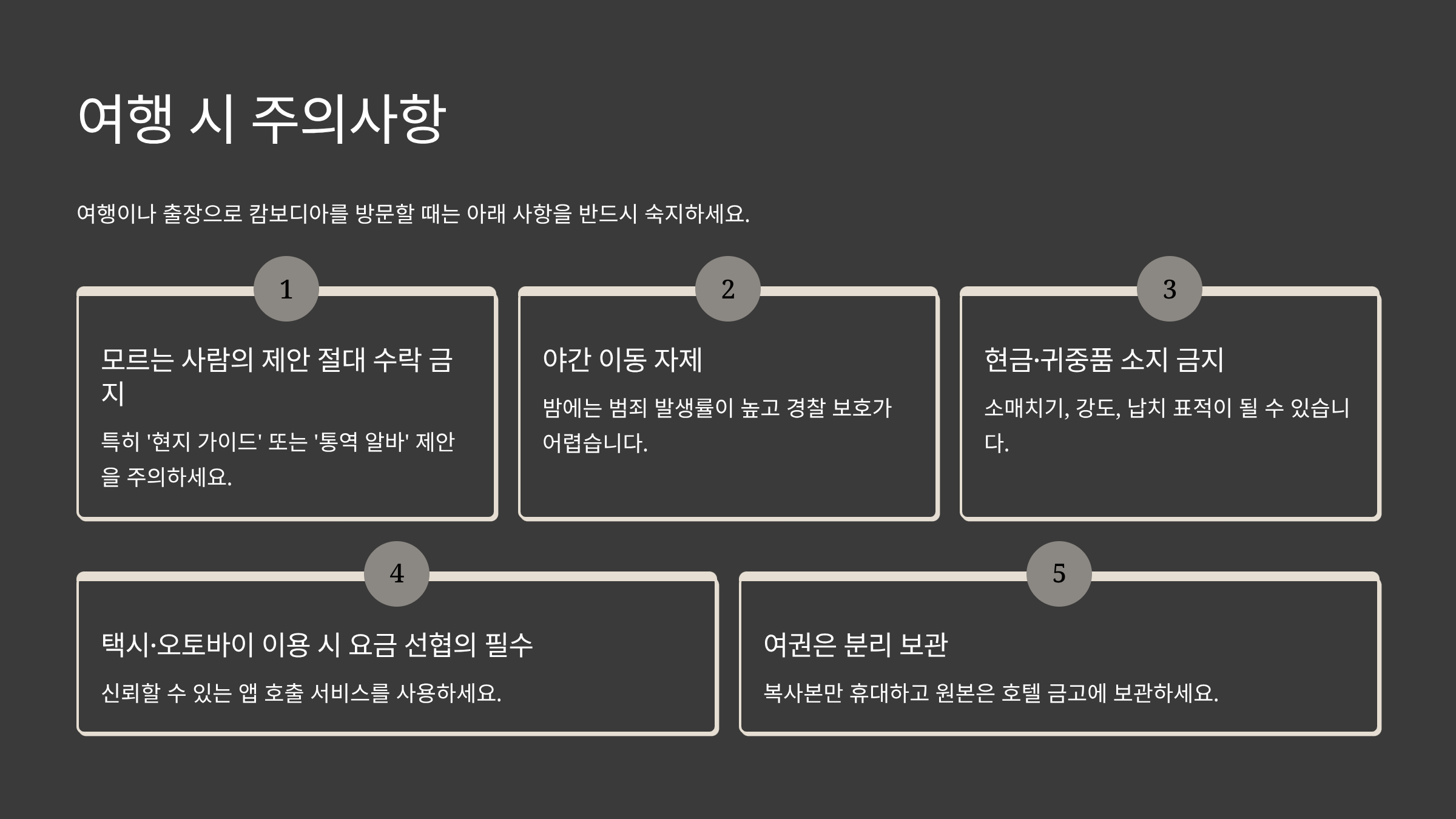 캄보디아 여행 또는 단기 체류를 계획 중이라면, 반드시 아래 내용을 숙지해 안전을 확보해야 합니다.